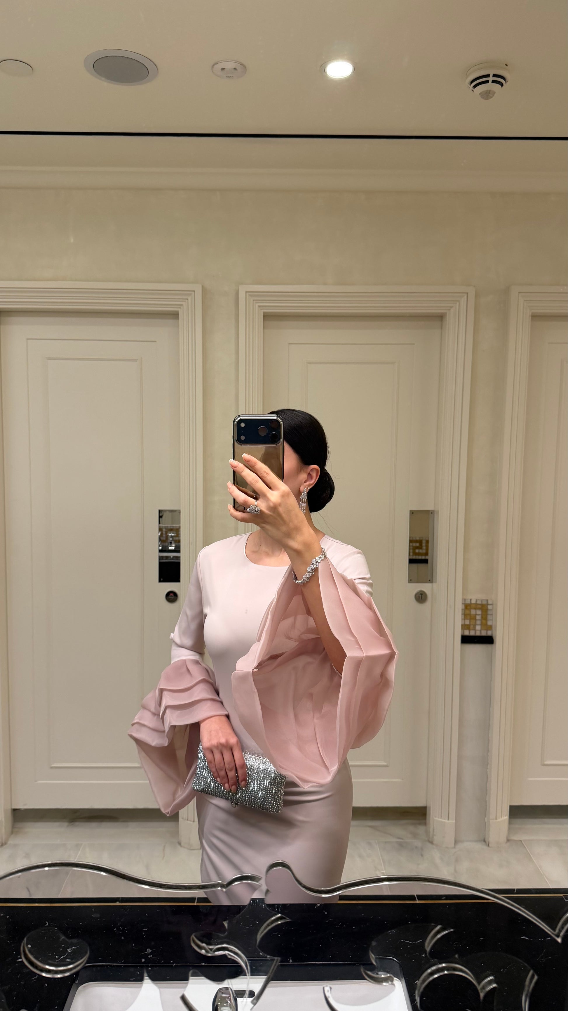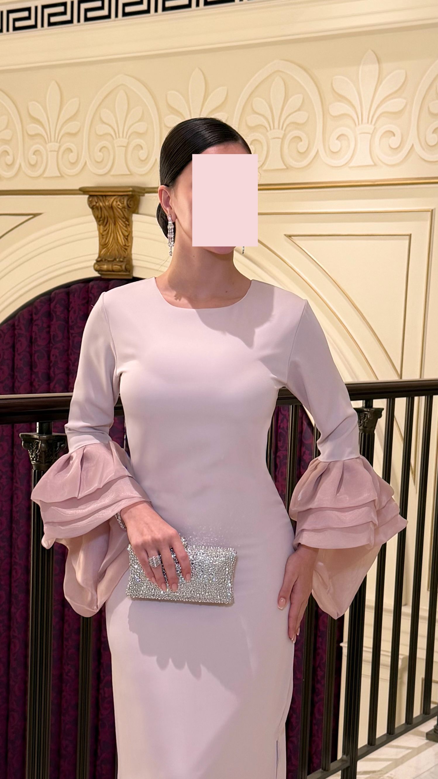 The Margaret Blush dress exudes elegance with its soft hue, flowing sleeves, and sleek silhouette perfect for any refined occasion.